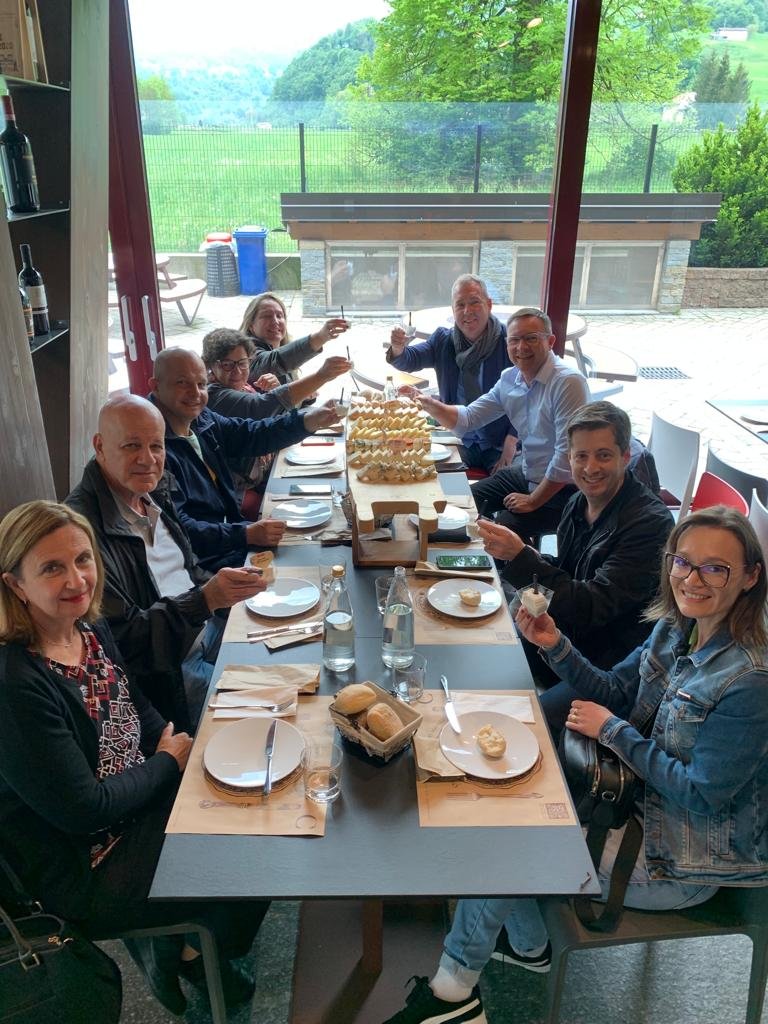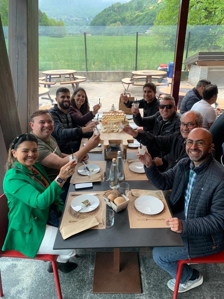 No dia 07 de maio, a equipe seguiu para Passo de São Gotardo, no sul da Suíça, região conhecida por ligar a Suíça de língua Italiana e a de língua alemã. Realizamos uma visita no Caseificio Del Gottardo, premiado com a medalha de bronze no World Cheese Awards 2022, com o queijo Il Merlottino Lati. A fábrica, com capacidade para 6000 litros de leite/dia, está localizada no pé da montanha, num lugar pitoresco e gracioso, com as vacas alimentadas em pastagens peculiares que, com a alteração ao decorrer do ano, caracterizam as estações nos sabores e texturas dos queijos produzidos, como queijos Semiduros, fondue e, principalmente, o queijo Raclete, tipicamente suíço. Este é um queijo que é servido quente, rico em sabores e aromas típicos do leite produzido na montanha ticinesa.