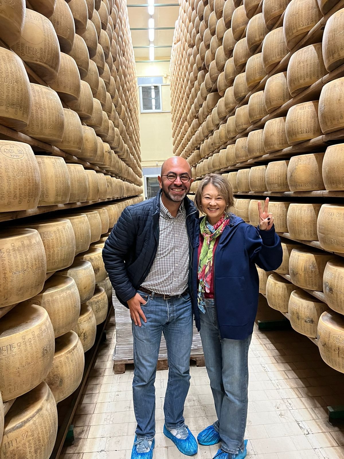No dia 10, iniciamos o dia com uma visita especial à estrutura da Azienda Agrícola Bertinelli, em Parma, na região de Emília Romana. Nesta fábrica pudemos conhecer toda a produção do legítimo Parmigiano Reggiano, incluindo a fazenda de produção do leite utilizado para a fabricação dos queijos. Tivemos a oportunidade de conhecer o Sr. Bertinelli, cujo filho é o presidente do consórcio Parmigiano Reggiano D.O.P e proprietário da fábrica. Com muita simpatia, ele nos contou um pouco sua história.