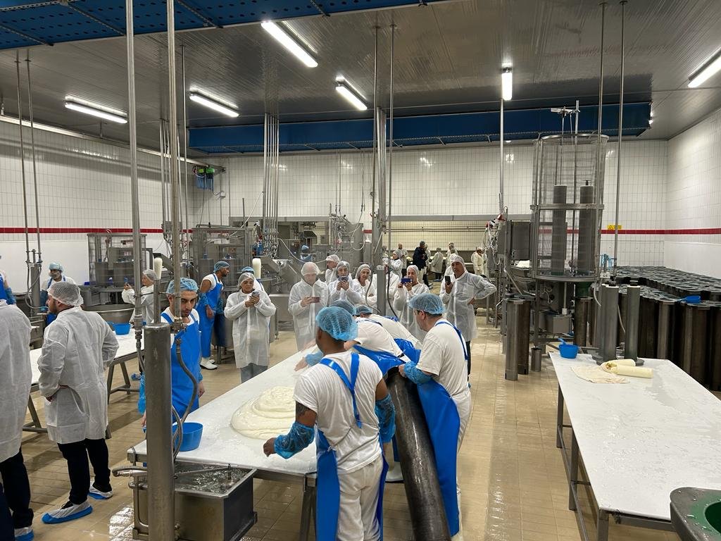 Esta fábrica que visitamos conta com uma estrutura de câmaras frias, onde são realizadas apenas as etapas de maturação, tratamentos das cascas, fracionamento e embalagem, ou seja, eram recebidos os queijos frescos com apenas um dia de fabricação, ainda sem sal, onde recebem todo tratamento necessário para caracterização de cada tipo de queijo.